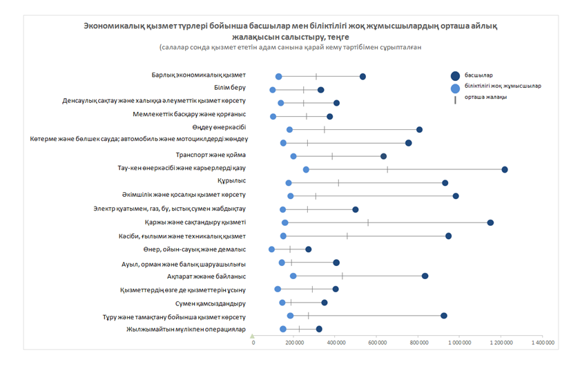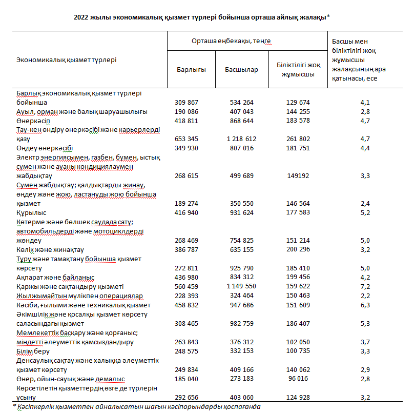 2022 жылдың қорытындысы бойынша ірілендірілген топтар арасында орташа жалақының ең көп мөлшері басшыларда, ең азы біліктілігі жоқ жұмысшыларда болған. Мәселен, басшылардың орташа жалақысы (534 мың теңге) біліктілігі жоқ жұмысшылардың жалақысынан 4,1 есе (129 мың теңге) асып түскен. Қаржы және сақтандыру қызметі саласындағы басшылық құрам мен біліктілігі жоқ персонал арасындағы еңбекақының айырмасы 7,2 есе, тиісінше 1 149 мың және 159 мың теңгені құрады. Сондай-ақ, осы екі қызмет тобы арасындағы еңбекақы жоғары айырмашылық кәсіби, ғылыми және техникалық қызмет саласында – 6,3 есе, әкімшілік және қосалқы қызмет көрсету саласындағы қызмет бойынша – 5,3 есе байқалды.